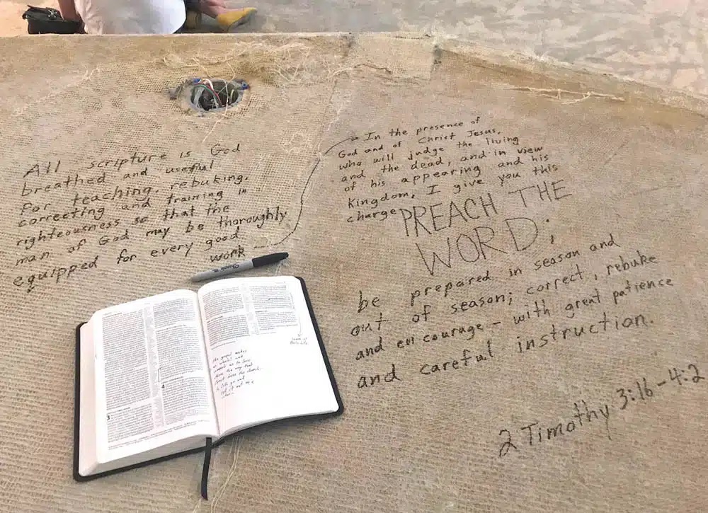 Among the Scripture verses written below the flooring in the renovated worship space at LifeBrook Church in Houston is a reminder at the pulpit to preach the Word.